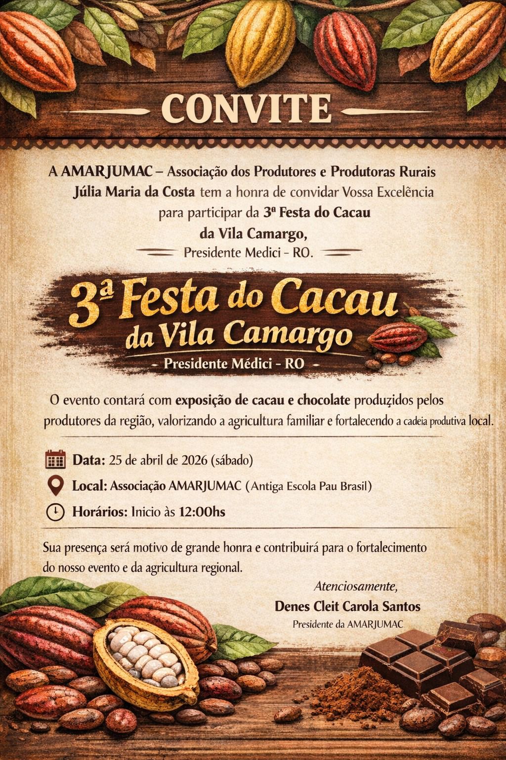 No próximo dia 25 de abril, a Amarjumac – Associação dos Produtores e Produtoras Rurais Júlia Maria da Costa realiza a 3ª edição da Festa do Cacau, evento que já se tornou tradição na região. A iniciativa tem como objetivo valorizar os produtores locais e fortalecer a agricultura familiar por meio da divulgação dos produtos derivados do cacau. A festa será realizada na Vila Camargo, na antiga Escola Pau Brasil.