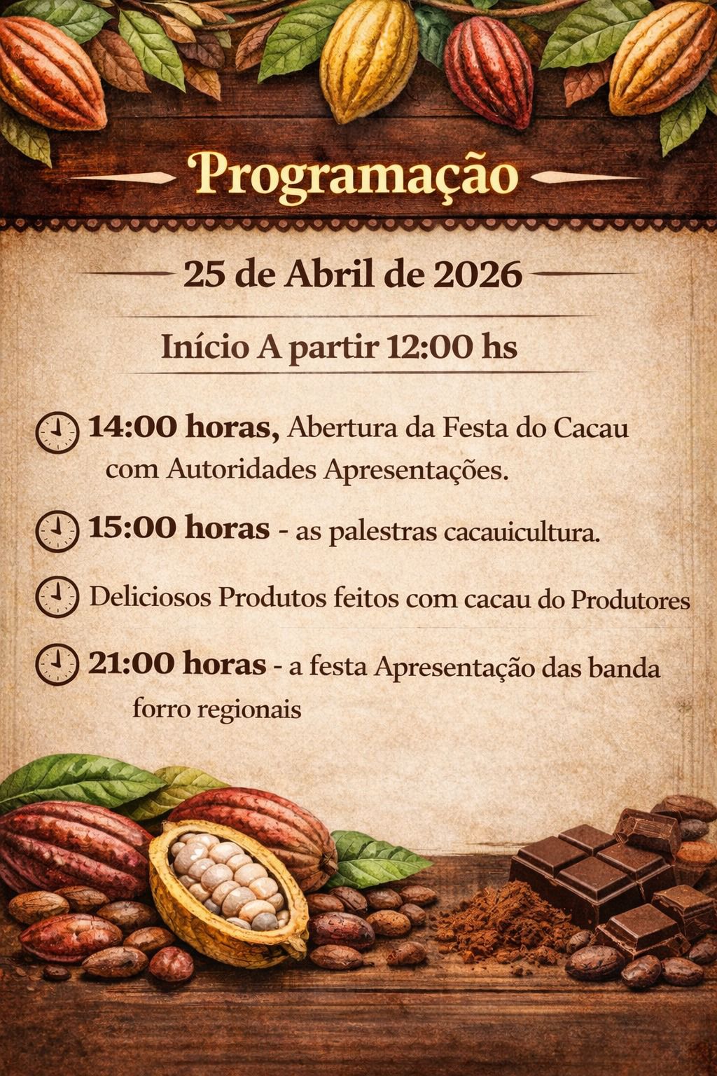 A programação terá início às 12 horas, com a abertura oficial, seguida de uma exposição especial de cacau e chocolates artesanais produzidos por agricultores da região. O espaço será dedicado à apresentação e comercialização dos produtos, promovendo geração de renda e incentivo ao consumo local.