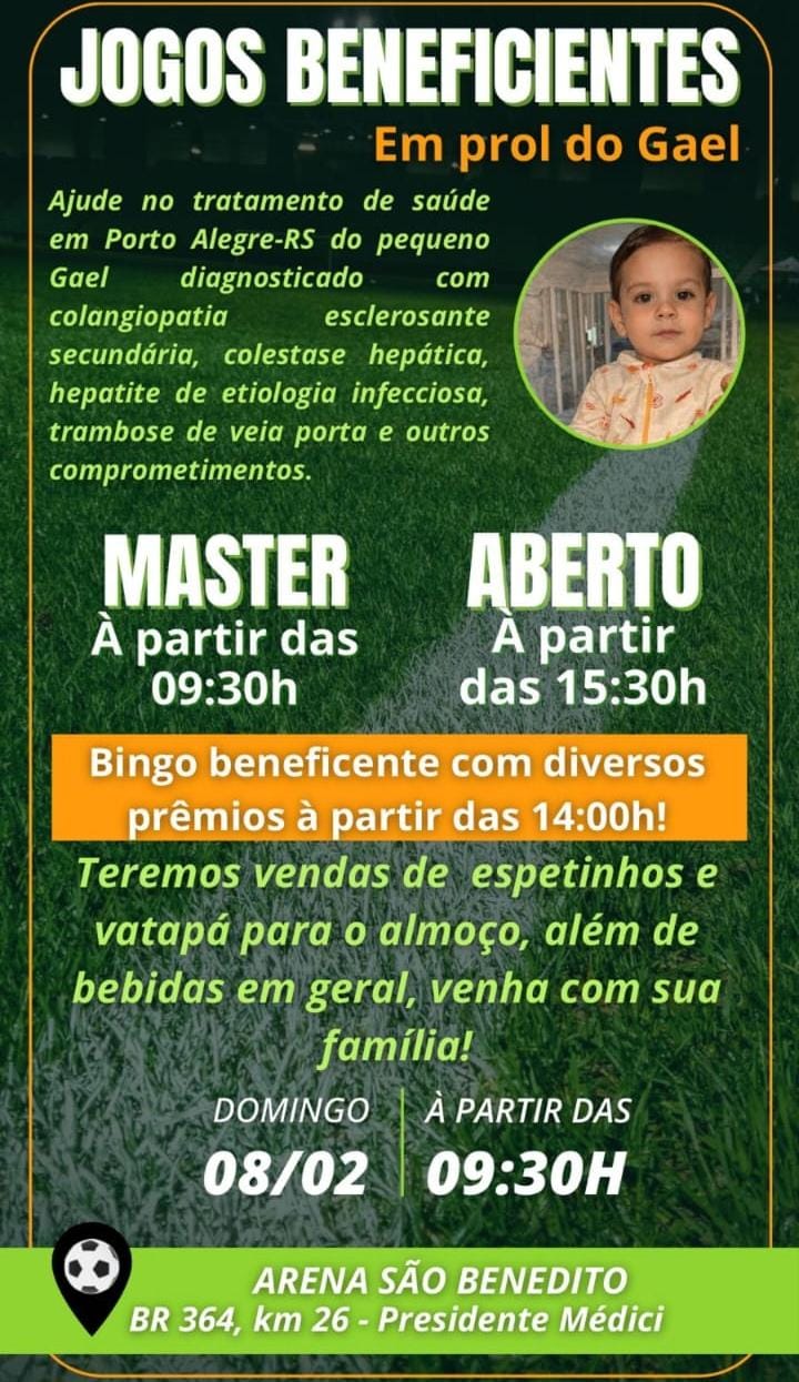 O evento acontecerá na Arena São Benedito, localizada às margens da BR-364, no km 26, e contará com uma programação esportiva ao longo de todo o dia. Os jogos terão início às 8h30, seguindo no decorrer do dia, reunindo atletas, amigos e apoiadores em um grande gesto de solidariedade.