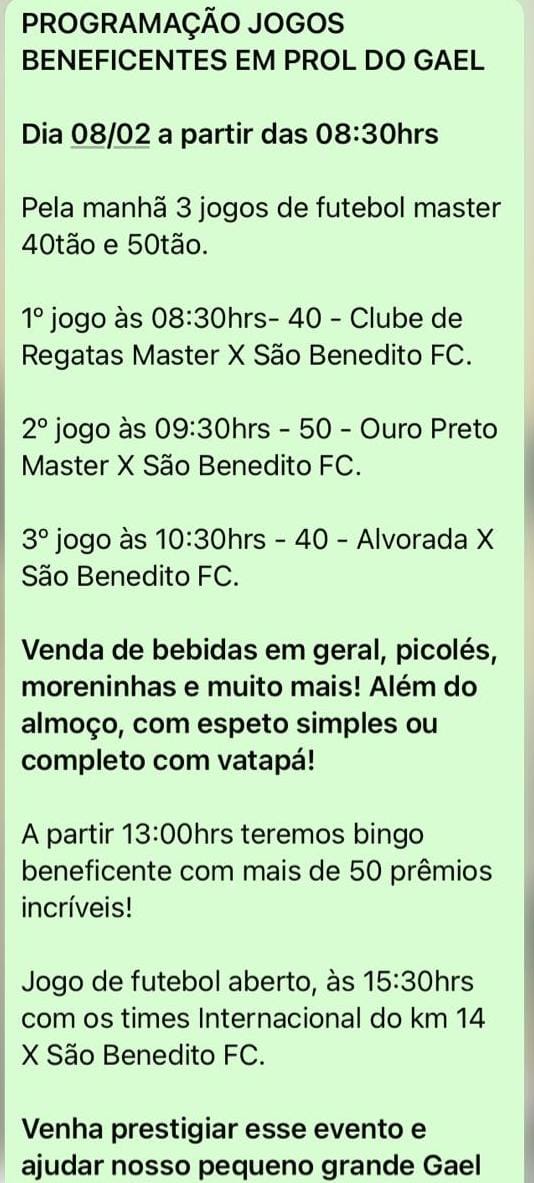 Além das partidas, o público poderá contribuir adquirindo alimentos no local. Haverá venda de espetinhos, vatapá para o almoço e bebidas em geral. A partir das 14 horas, será realizado um bingo com diversos prêmios, fortalecendo ainda mais a arrecadação em prol da causa. Toda a renda obtida será destinada a ajudar Gael e sua família. A organização convida toda a comunidade a prestigiar e participar desse importante ato de solidariedade.