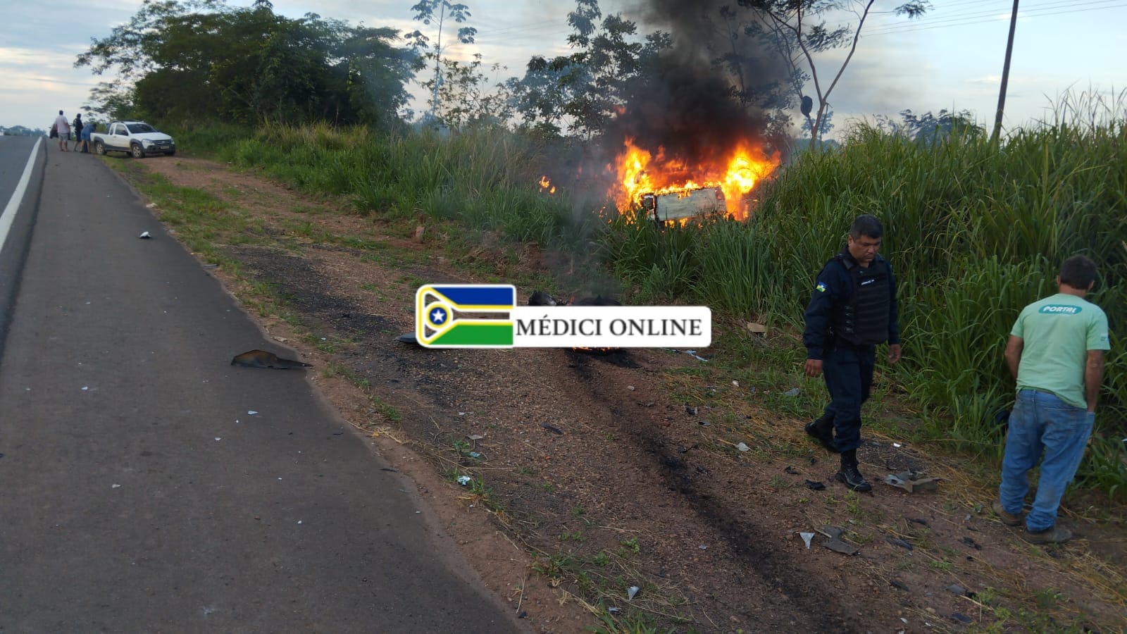 De acordo com informações preliminares, o impacto foi intenso, resultando em duas vítimas fatais ainda no local do acidente. Logo após a colisão, o veículo incendiou-se, ficando completamente destruído pelas chamas.