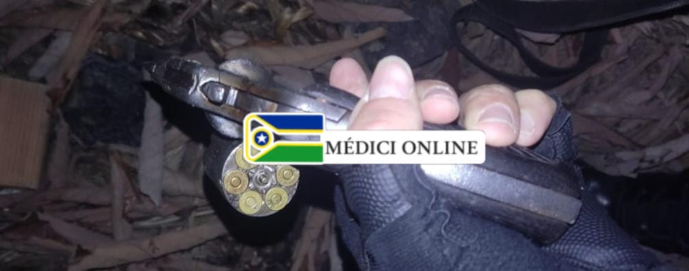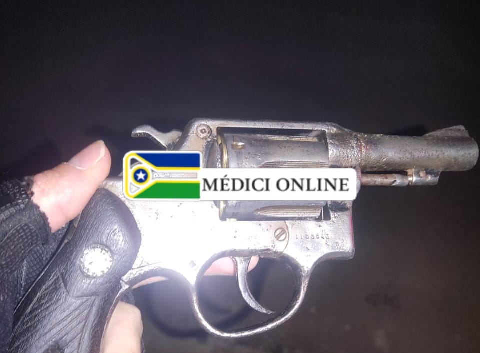 No acompanhamento policial, os militares seguiram pela BR-364 até a Rua Presidente Médici, onde o condutor entrou em uma residência localizada na Rua 07 de Setembro. Nos fundos do imóvel, os policiais conseguiram interceptar os suspeitos. Durante a abordagem, o passageiro foi visto dispensando um objeto na área do quintal. Após buscas no local, os policiais encontraram um revólver calibre .38, contendo seis munições intactas.
